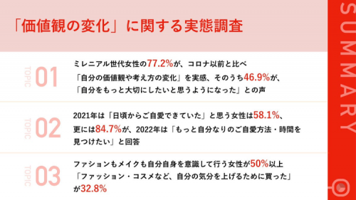 2022年は自分なりのご自愛方法・時間を見つけたいと感じている女性が多く、自分の気分を上げるためにファッションやコスメを楽しむ女性が増加する傾向が見られます。新型コロナウイルス感染症が流行したことで、家にこもり、自分と向き合う時間が増えたためかもしれませんね。