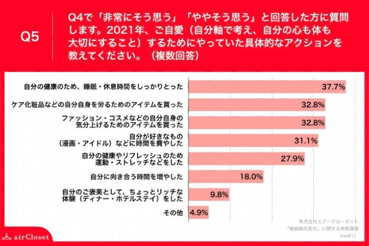 「Q5.2021年、あなたが、自分のためにやっていた具体的な行動はなんですか」(n=61)と聞いたところ、「自分の健康のため、睡眠・休息時間をしっかりとった」が37.7%、「ケア化粧品などの自分自身を労るためのアイテムを買った」「ファッションコスメなどの自分自身の気分を上げるためのアイテムを買った」が32.8%という回答となりました。