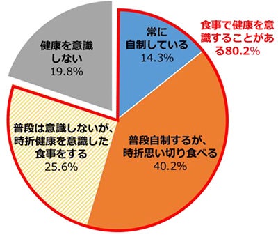 食生活において健康を意識することがあるか調査したところ、 なんらかの形で意識している人は80.2%と大多数を占めることが分かりました。 その内訳を見ると、「普段から健康に気をつかった食生活をしているが、時折食べたいものを食べたいだけ食べる日がある」が最も多く40.2%、 次いで「普段はそれほど健康に気を遣っていないがたまに健康を意識した食事内容にしている」が25.6%でした。