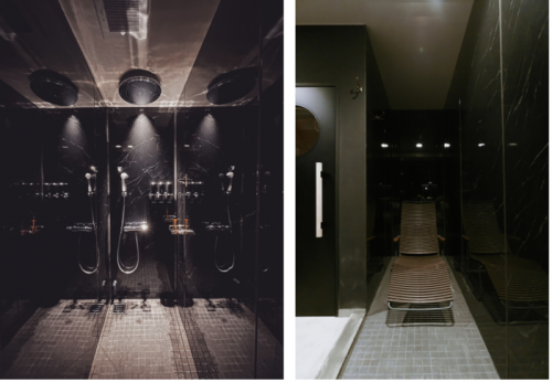 サウナで体を温めたあとは、水風呂の代わりにこだわりの冷水浴を! 水温調整ができる通常シャワーヘッド「ミラブル」と、チラーシステムでキンキンに冷やされた冷水が放出する大型オーバーヘッドシャワー(グロエ製)のどちらも利用できます。