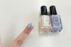 さっそく塗ってみました。2度塗りですが、1度塗りでもしっかり発色。速乾なので、15分程度で塗ることができました。こちらのネイルはラメのマットタイプなので、ざらざらとした感じがコットンパールのような、ニュアンスのある風合いを演出してくれます。
