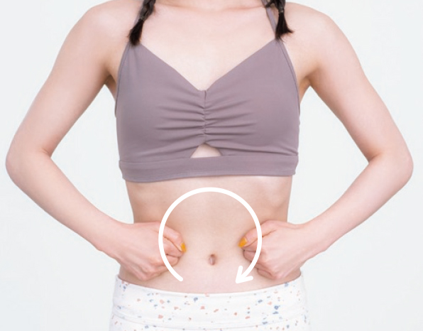 「両手で軽く握り拳を作り、気持ちいい程度にお腹に圧をかけながら、おへそを中心にして時計回りに円を描くようにお腹をさすります。このマッサージは、朝や入浴後などに行ってもお腹がスッキリしますよ!」