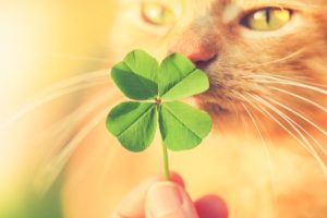 • Beautiful,Orange,Tabby,Cat,Sniffing,A,Lucky,Four,Leaf,Clover.