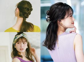「くるりんぱ」とは、結んだ髪の真ん中を開いて、毛束を入れ、くるりと回すアレンジ。こちらは、くるりんぱとハーフアップを組み合わせた簡単アレンジ。