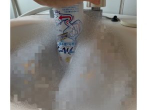 排水口とオーバーフローめがけてシュッシュッとカビキラーの泡を吹きかけます。15分ほど放置したら、水で排水口内のカビキラーを流します。バブルーンには酸性タイプの成分が入っていないので、カビキラーと併用しても問題ないですが、念の為水でしっかり流し切りましょう!