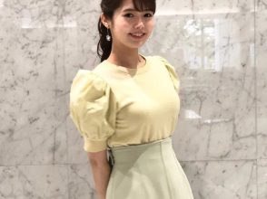 クリームイエローニットと、ミントスカートのカラーMIXが今っぽさたっぷり! 派手ではなく〝印象的〟に仕上げるコツは、ベージュを繋ぎ役にすること。柔らかなトーンで全身をまとめることで、優しいムードに仕上がります。