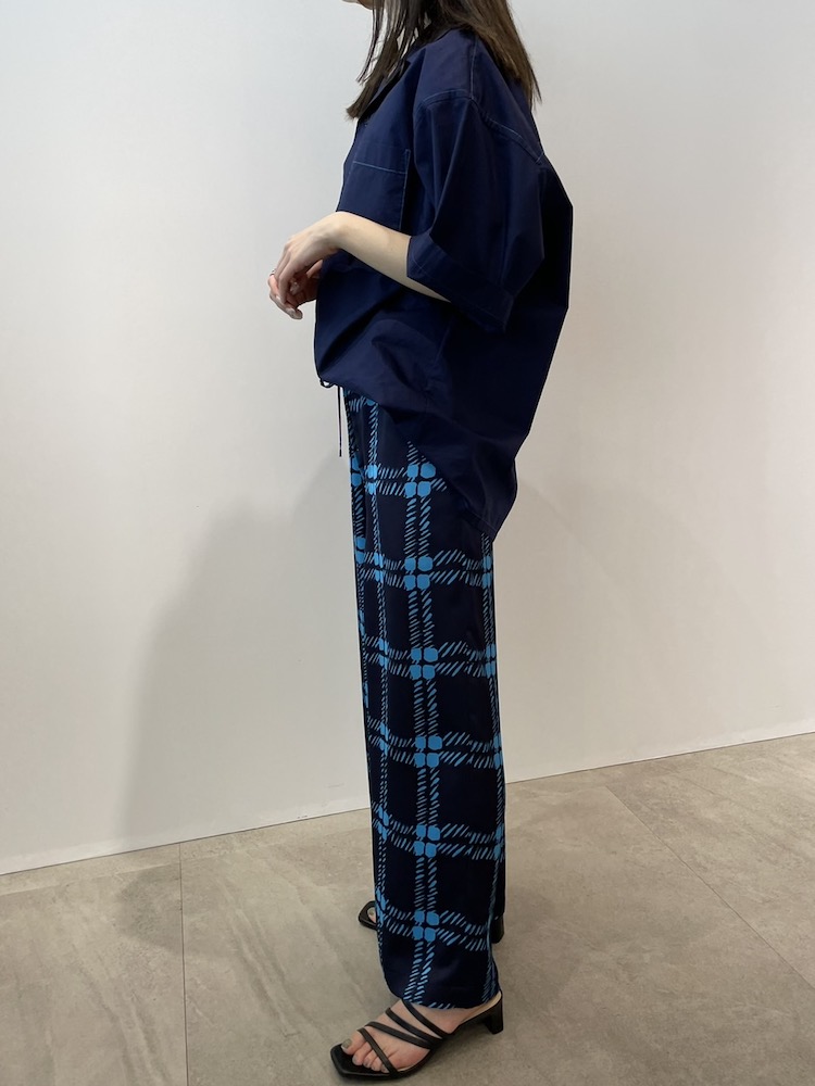 サテンパンツは、青×ネイビーのモードな配色でカジュアルだけど大人っぽさもあるデザイン。