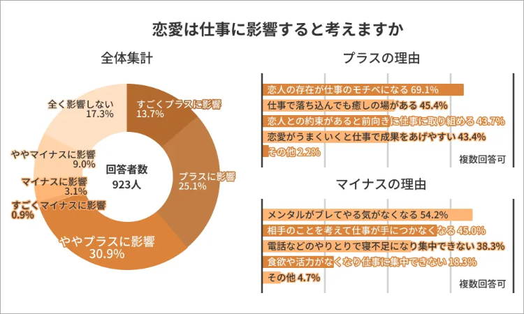 「すごくプラスに影響する」「プラスに影響する」「ややプラスに影響する」と回答した人が、合計で69.7%と、“プラスの影響派”が“マイナスの影響派”を上回りました。それぞれの理由を見ていくと、プラスの理由は「恋人の存在がモチベになる」が69.1%で最も多く、マイナスの理由は「メンタルがブレてやる気がなくなる」が54.2%で最多回答となっています。いい意味でも悪い意味でも、恋愛がメンタルに大きな影響を与えるものだということがよく分かりますね。