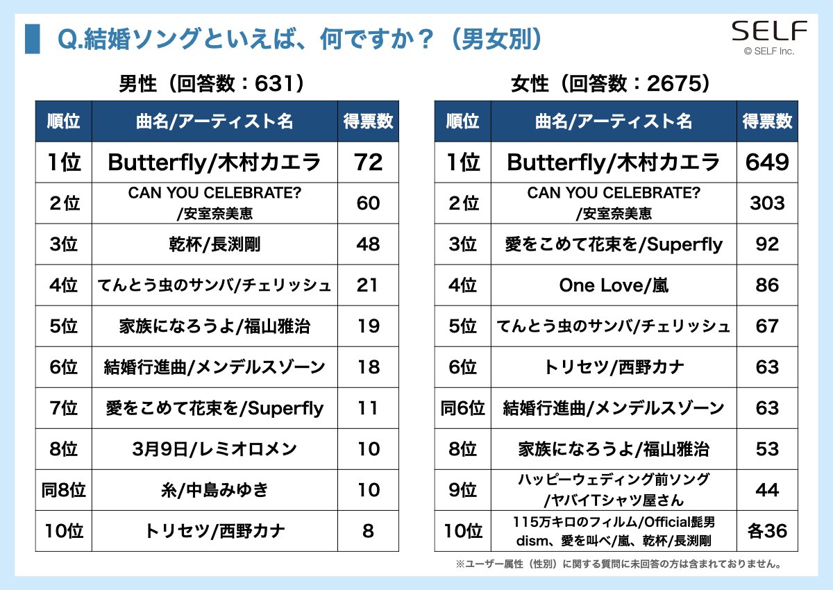 全体の1位は『Butterfly/木村カエラ』!なんと、2位の『CAN YOU CELEBRATE?/安室奈美恵』の倍以上の投票が寄せられました。票は1位と2位に集中しているものの、どの曲も結婚式で流れる定番ソングばかりです。