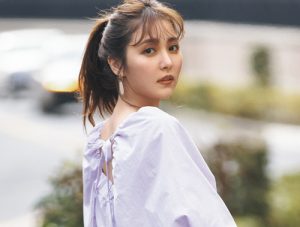 スリットで美脚見えも叶うブルーパンツに白トップスを投入。トップスはチュールビスチェ×透けタートルの優しげな白コンビで着映えも抜群。鮮やかな水色のパンツと組み合わせて周りと差のつく着こなしに。淡い配色を引き立てるエクリュのハーフムーンバッグもトレンド感◎。