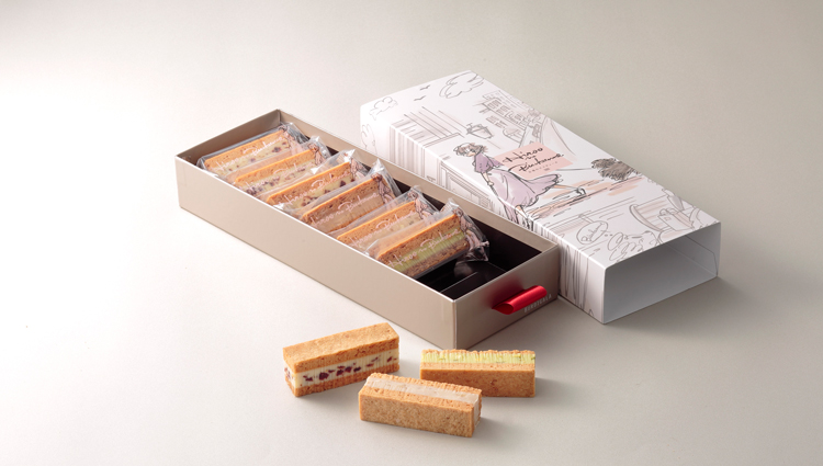 ふわふわのワッフル生地でクリームやフルーツをサンドした人気商品。このセットでしか味わえない限定フレーバー5種入り! 丸の内駅舎のイラスト入りのパッケージで、お土産にぴったりです。