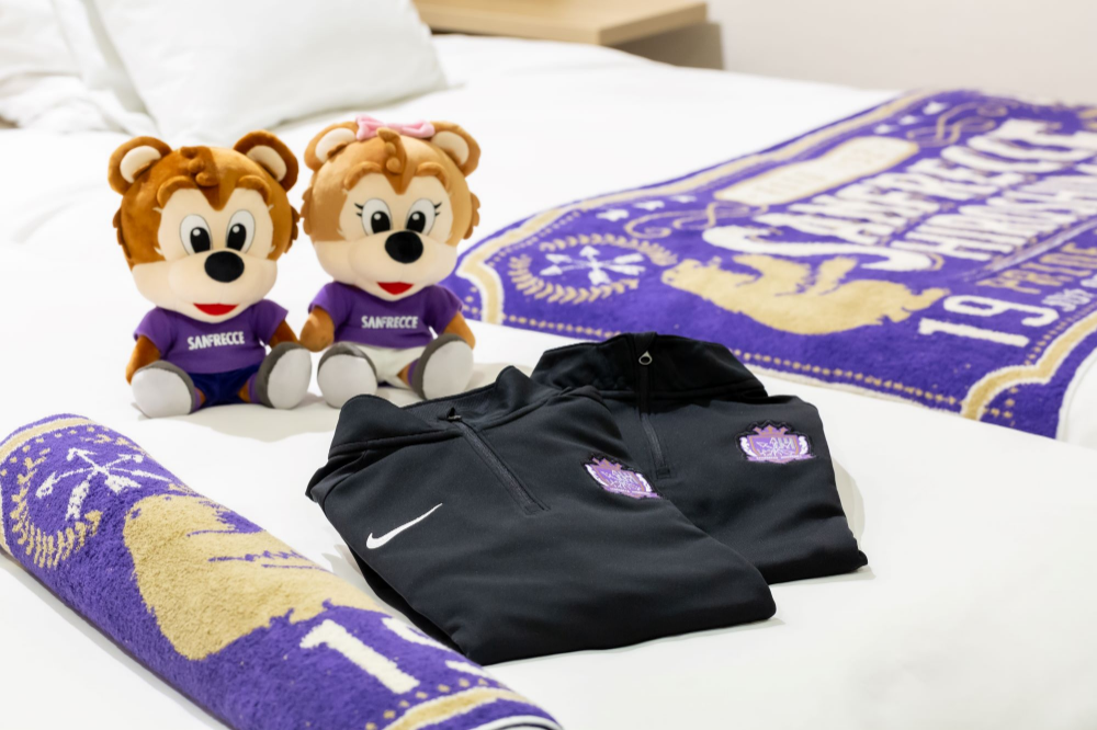 お部屋には、チームマスコットの”サンチェ”と”フレッチェ”のぬいぐるみや、オリジナルカップが用意されています!さらに非売品のトレーニングウェアをルームウェアとしているので、サンフレッチェのメンバーになった気分でぐっすり眠ることができます!ファンにはうれしい、サンフレッチェ一色のホテルルームとなっています!