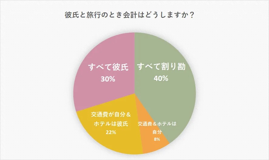 続いて、一泊二日、彼氏と旅行するとしたらお会計はどうするか、20代の彼氏持ち女性50人に聞いてみました。