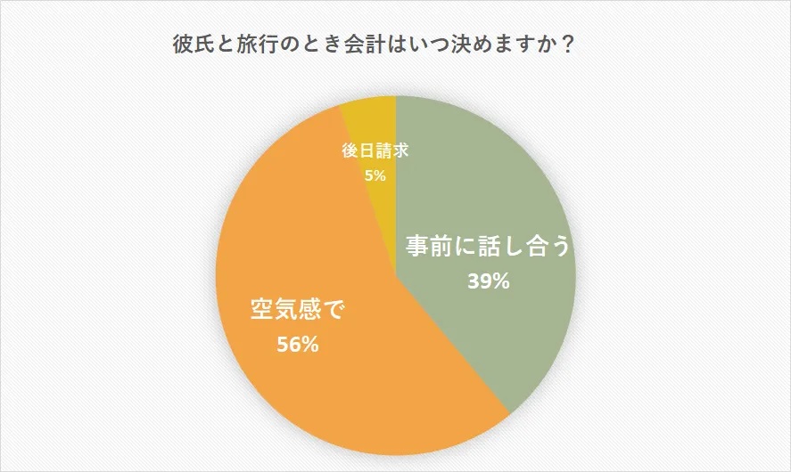 6割弱のカップルが、その場の空気感で決めていることがわかりました。付き合って長いカップルや、何回も旅行に出かけているカップルはお互いの心地よい会計感がわかっているかもしれませんが、付き合ってから初めての旅行などの場合、その空気感をつかむのも多少難しそう…。また「後日請求」に関しては「え?」と思う方もいるかもしれませんが、飛行機やホテルは事前にどちらかの決済手段を使用している場合が多いため、ワリカンになる場合は自然と後日請求になるのだとか。