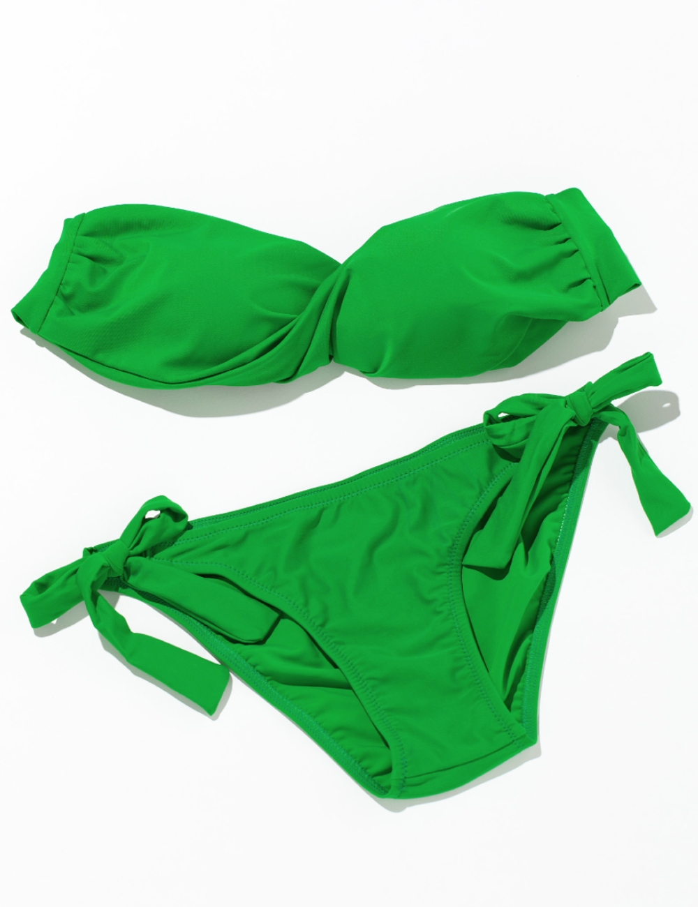 鮮やかグリーンのバンドゥビキニは、海外セレブっぽいミニマルなデザインがおしゃれ。トップスはカップのツイストでバストがふっくらキレイに盛れるのでメリハリも◎。フィット感を調節できるバックリボンをぎゅっと結べば、自然と谷間もメイクできちゃいます!
