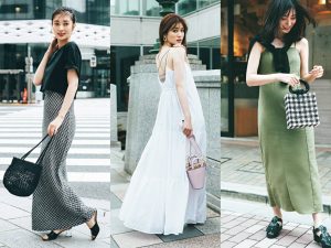 バッグ¥6,930(ジャック・オブ・オール・トレーズ<MADE IN MADA>)、靴¥22,000(ビルケンシュトック・ジャパン<ビルケンシュトック>)、ワンピース¥13,200(AKTE)、イヤリング¥2,750(mimi33/サンポークリエイト)、ネックレス¥94,600・リング¥57,200(ココシュニック)、バングル¥13,200(ココシュニック オンキッチュ 有楽町マルイ店<マークスティールジュエリー>)