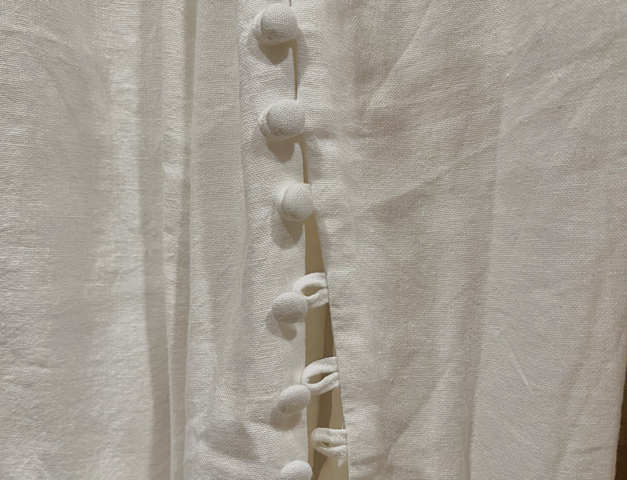 ループ(loop)には英語で「輪」という意味があり(プログレッシブ英和中辞典調べ)こんな感じの紐や細い帯状にした布で作ったループにボタンをひっかけて留めるタイプのボタンのこと。くるみボタンと組み合わせて使われることも多い「ループボタン」はスリットや背中、フロント上部などに開きを作ってつけられることが多く、絶妙な抜け感とどこかレトロな印象が魅力です。