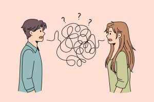 Problems in communication of couple concept. Frustrated young man and woman standing with thorn thread between them having troubles with understanding each other vector illustration