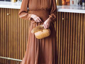 共布ベルト付きワンピース¥23,100・靴¥14,300(リランドチュール)、バッグ・イヤリング/スタイリスト私物