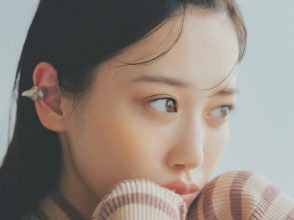 眉にピンクが効いていて、リップもくすみイエローがポイントになっているので、チークは塗らず抜くのがベストバランス! チークレスで仕上げるとナチュラル感とラフな印象も高まる。