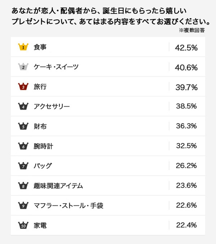 1位から3位までを見てみると、皆さん無理のない予算でプレゼントを選んでいることがわかります。ふたりの誕生日は何回だってお祝いするものだから、お互い「自然に贈れる/貰えるもの」が一番嬉しいですよね。