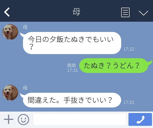 「母から『今日の夕飯たぬきでもいい?』とLINE。たぬき?うどん?と返したら『手抜き』の間違いで爆笑。でも結局たぬきうどんになったので、間違いでもなかったです笑笑」(19歳・学生)