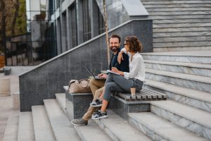 • Attractive,Couple,Of,Man,And,Woman,Sitting,On,Stairs,In