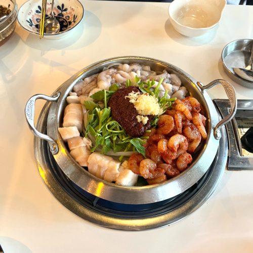 こちらのお店、看板メニューは大人気の“ナッコプセ”。”ナッコプセ”とは、タコ、ホルモン、エビの頭文字で、その名の通り、3種の具材を甘辛〜く煮込んで食べる韓国料理なんです。