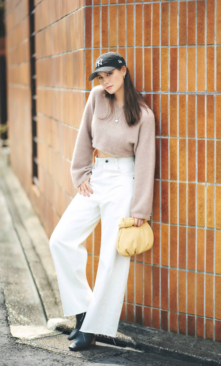 ニット¥55,000(ラインヴァンド<ラインヴァンド>)、パンツ¥12,100(COLLAGE GALLARDAGALANTE 新宿ミロード店〈Q.anos〉)、バッグ¥8,800(キャセリーニ<ル・ベルニ>)、靴¥26,400(ダイアナ 銀座本店<ダイアナ>)、帽子¥4,400(ニューエラジャパン)、ピアス¥15,290(ズットホリック<パズ・コレクティブ>)、ネックレス¥27,500(レイ ビームス 新宿<アニカイネズ>)、リング[二連風]¥18,700(ココシュニック)