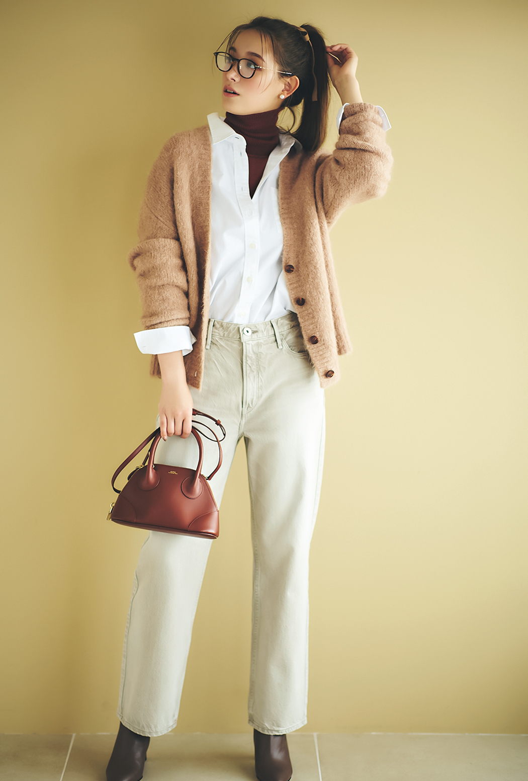 アルパカをブレンドしたふわ軽タッチのベージュカーデ。茶系でつないだタートルネックニットと抜け感を加える白シャツのレイヤードにはおれば、ひと手間感のあるこなれたスタイリングに。