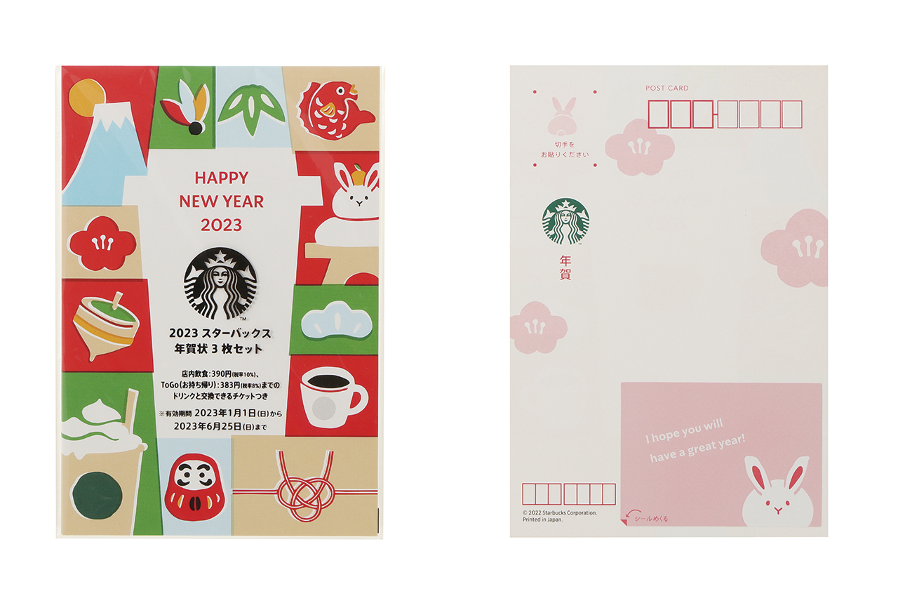 スタバオリジナルの年賀状が登場。 お正月らしいモチーフにスターバックスのアイコンがにぎやかに散りばめられたデザインです。ドリンクチケットが付いているから、新年のご挨拶と共にちょっとしたサプライズギフトにも!