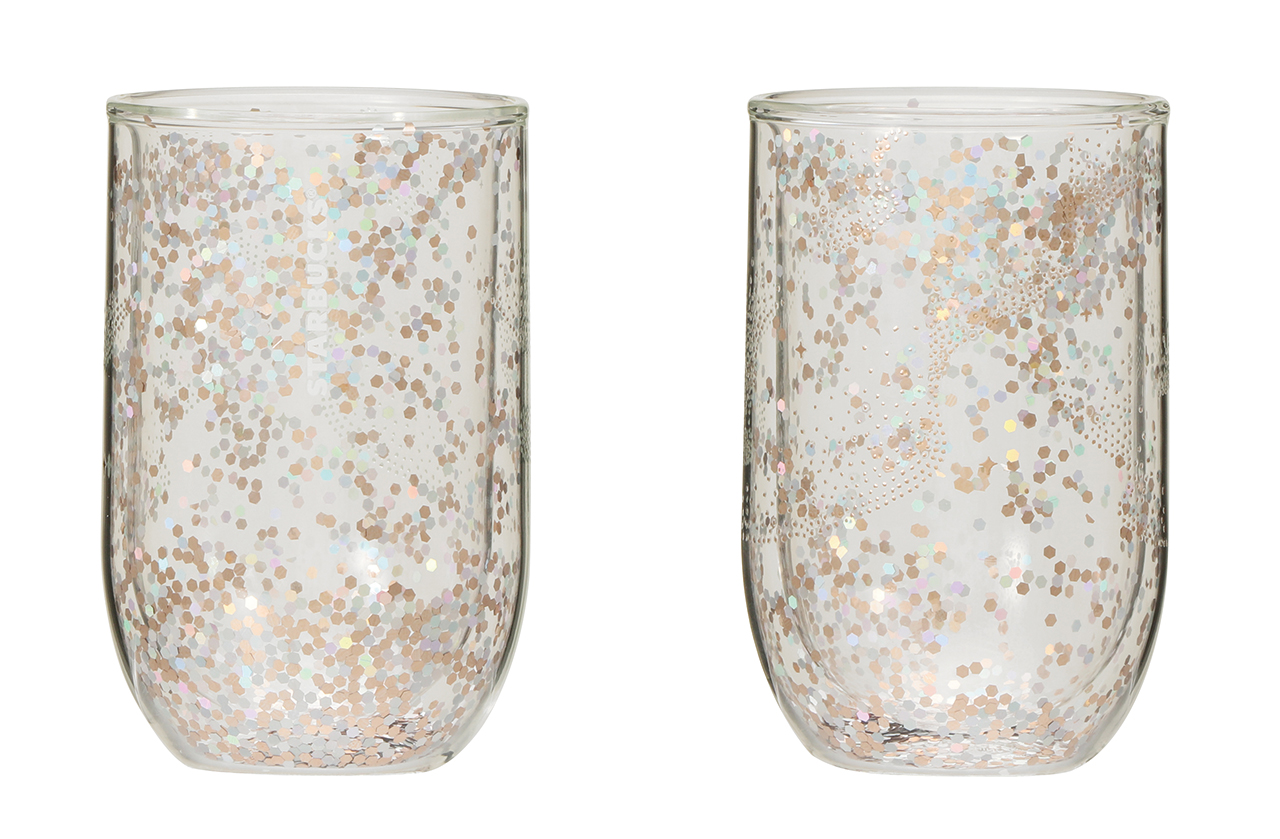 グラス全体に金色の箔でオーロラを表現しており、シンプルながらも華やかな印象の耐熱グラス。また。2重構造の内側にはコンフェッティも♡ ダブルウォールグラスなので、ホットでも熱くなくアイスでも結露しづらいためオールシーズン使えるのも嬉しい!