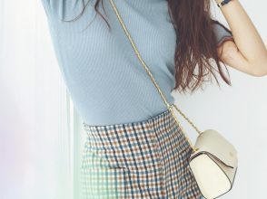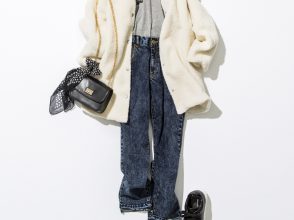 ジャケット¥17,930(PROPORTION BODY DRESSING<EDIT COLOGNE>)、ニット¥3,300(Discoat 新宿サブナード店<Discoat>)、スカート[ペチコート付き]¥36,300(CASA FLINE表参道本店<CASA FLINE>)、バッグ¥5,390(FREDY&GLOSTERラゾーナ川崎店<fredyemue>)、靴¥10,890(RANDA)、イヤリング¥5,400(アビステ)、ネックレス¥5,720(レイ ビームス 新宿<レイ ビームス>)