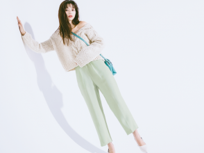 ニット¥55,000(ラインヴァンド<ラインヴァンド>)、パンツ¥12,100(COLLAGE GALLARDAGALANTE 新宿ミロード店<Q.anos>)、バッグ¥8,800(キャセリーニ<ル・ベルニ>)、靴¥26,400(ダイアナ 銀座本店<ダイアナ>)、帽子¥4,400(ニューエラジャパン<New Era®>)、ピアス¥15,290(ズットホリック<パズ・コレクティブ>)、ネックレス¥27,500(レイ ビームス 新宿<アニカイネズ>)、リング[二連風]¥18,700(ココシュニック)