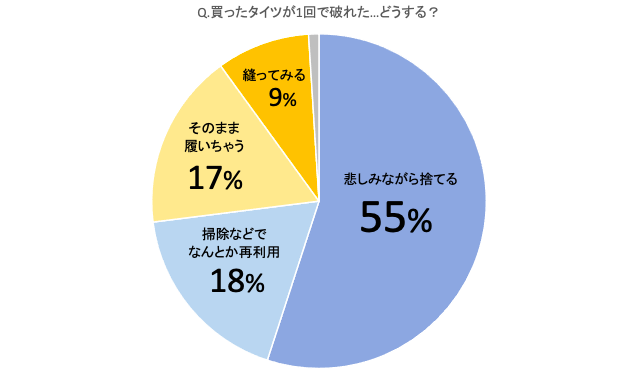 「悲しみながら捨てる」(55%)は今回最も多かった回答で、半分以上の割合を占めていました。それに続いて、「掃除などでなんとか再利用」(18%)「そのまま履いちゃう」(17%)「縫ってみる」(9%)と、穴のあいたタイツをどうにかこうにか使おうとする回答が見られました。その他「とりあえずとっておく」なんて回答も。なぜなのか、具体的な理由を見ていきましょう。