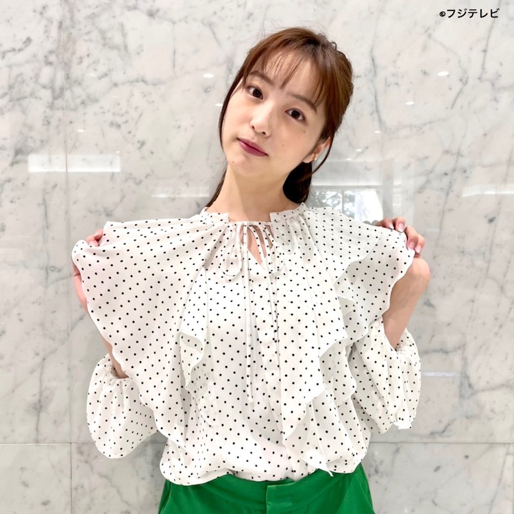 たっぷりのフリルが付いたドットブラウスがロマンティック! 顔まわりがパッと華やぐので、オンライン映えもバッチリです。甘くなりすぎないように、鮮やかグリーンのパンツと黒のサンダルで大人っぽく着こなして。