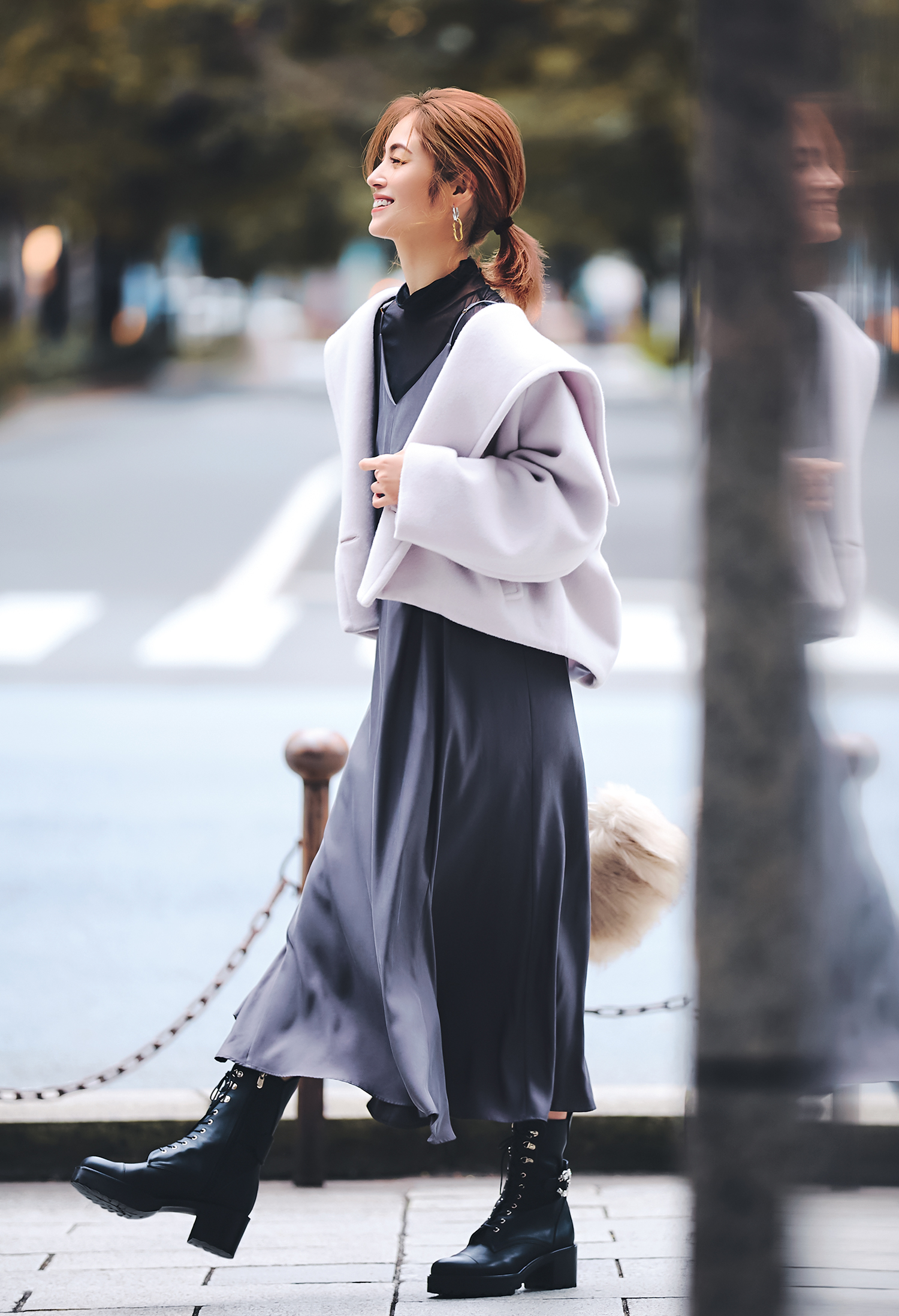 大きめのセーラーカラーとコクーンシルエットで、一見ベーシックなウールショートコートもすっかり今年顔。てろんとしたキャミワンピと温かみのあるウールコートを合わせて、素材感にメリハリをつけるのがコツ!