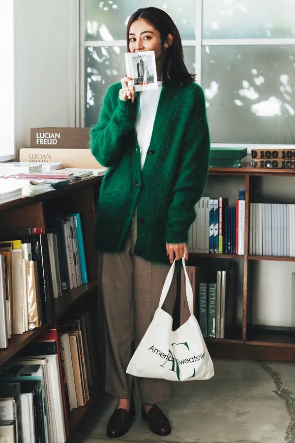 1枚でおしゃれっぽいボトルグリーンカーデは、秋冬コーデの頼もしい味方。チェック柄パンツやローファーなど正統派のトラッドアイテムと合わせることで、トレンドカラーが映えるうえにきれいめに着こなせる!