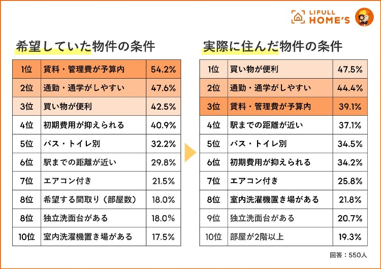 まずは、「希望していた物件の条件」と「実際に住んだ物件の条件」を調査。その結果、希望条件では、「賃料・管理費が予算内に収まる」という費用面をもっとも重視していたものの、実際に選んだ条件では「通勤・通学がしやすい」「買い物が便利である」という利便性がTOP2となりました。実際には約40%の人が希望をかなえられているようです。また、賃料や管理費に関しては、妥協している方が多いことがわかります。