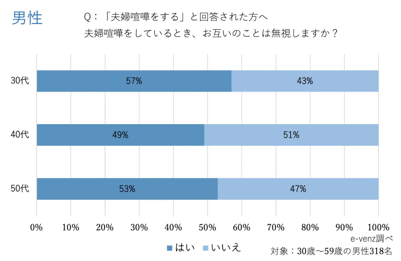男性も女性も、どの年代でも約半数の人が、夫婦喧嘩をしているとき、お互いのことを「無視する」と回答しました。喧嘩をすれば、お互いの顔も見たくなくなってしまうことくらいありますよね。
