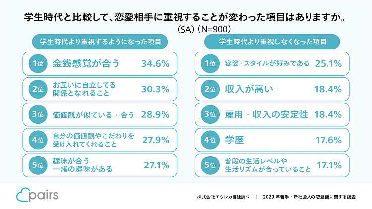 現在社会人の900人を対象に「学生時代と比較して、恋愛相手に重視することが変わった項目はありますか?」と聞くと、重視するようになった項目は「価値観」系統の項目に偏り、一方で重視しなくなった項目は「スペック」系統の項目に偏る結果となりました。学生時代から社会人になるにあたり、恋愛の価値観が外面から内面へシフトしていく傾向が強いことが明らかとなりました。