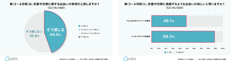 「春(3月~4月頃)は、恋愛や交際に関する『出会いの季節』だと感じますか?」と質問したところ、「そう感じる」との回答が44.6%と約2人に1人が出会いの季節と捉えていることが分かりました。