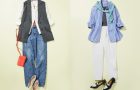 「小顔見え」おすすめの着こなしは、Iラインを意識したきれいめスタイル。春らしいベージュトーンにネイビーのジャケットを合わせることで全体が引き締まった印象に。やや高めの腰位置でのウエストマークが着やせに効果的。