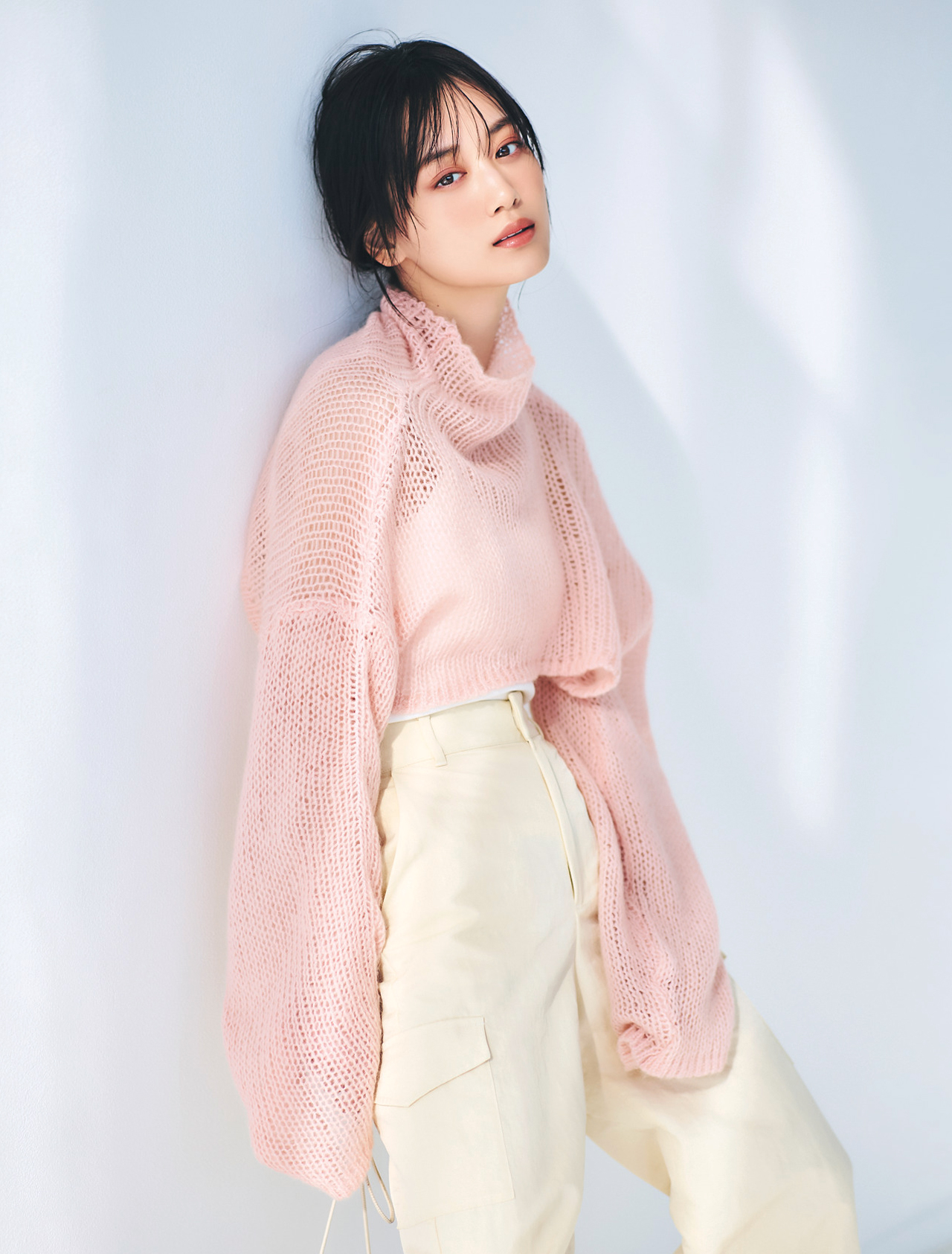 ゆるっとしたフォルムと潔い短丈がたまらなくかわいいピンクニットは、バニラカラーのカーゴパンツを合わせてちょっぴりかっこよく着るのが今の気分。カジュアルさんも、フェミニンさんもトライしやすいアイシーパステルコーデのできあがり♡