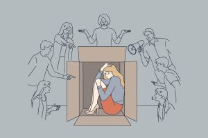 Pressure, bad emotions, desperate state concept. Unhappy stressed scared businesswoman sitting hiding inside box with negative human emotions feeling pressure and negative attitude from people
