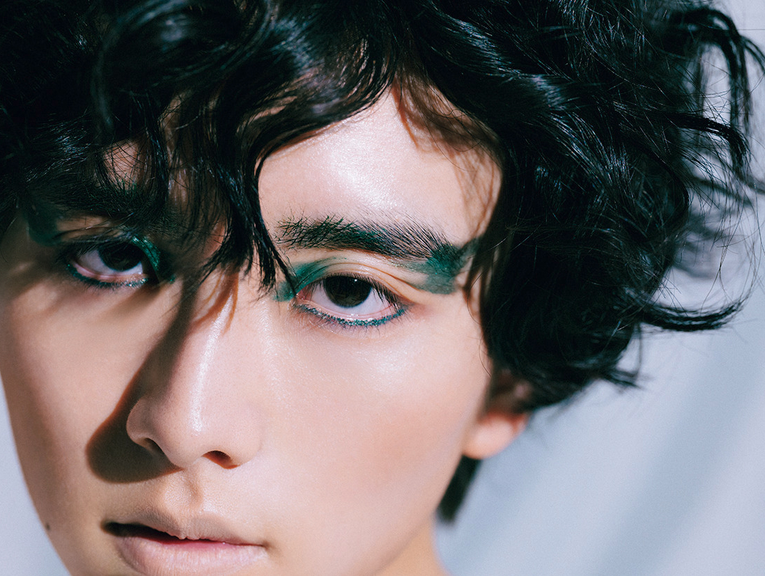 「風の神のような強さをまとうために使ったのは、グリーンのカラーアイテム。目の上は風のようにのびのびとしたラインを描き、軽やかさを演出するためにパウダーでぼかしを入れました。逆に目の下はくっきり発色するメタリックライナーを使い、隈取りのようにしっかり線を引いて印象を引き締め。これにより、ワイルドな雰囲気が出せた気がします。そういえば、下まぶたにアイラインを引くと小顔効果があると聞いたことがあります。やってみると確かに顔の下半分がすっきり見える気が…。黒や茶色のラインだときつく見えますが、キラキラ感のあるカラーラインなら抜け感も洒落感もあり、テンション高めな夏メイクにも合いそうです。普段、強風を天敵としている(髪が乱れ、帽子が飛んでいってしまうので…)僕ですが、神様になりきって撮影するのは楽しかったです。はためく白布が本物の雲のように見えるのもお気に入り」(板垣さん)