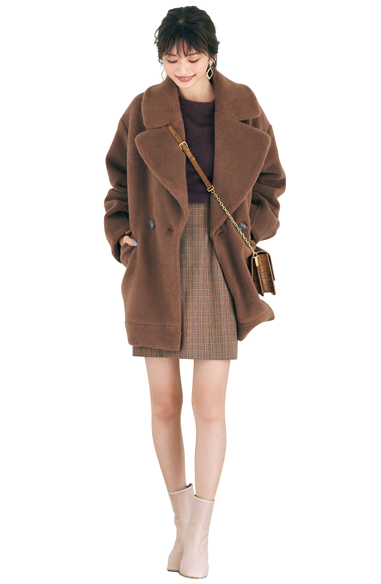 全身ブラウンコーデの足元はヌーディベージュで抜け感を。ブラウンのニットにチェックミニを合わせて、BIGシルエットのコートをプラス! 小ぶりのアコーディオンバッグを斜めに掛けることで、スタイルアップ効果もばっちり。トーンが異なるブラウンのグラデーションが優しい印象に着地するのも、肌なじみのいい最旬ブーツのおかげ。