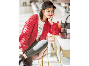 サーモンピンク×アッシュグレーのレトロ配色で優しく感度よく! 短めのシャギーがリッチな質感のコートとフリルブラウスがレディなムードを演出。甘くなりすぎないよう、パンツはグレンチェックでトラッドに振って。