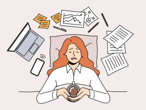 Exhausted woman lying in bed with coffee stressed with work. Tired female employee overwhelmed with job rest in bed. Fatigue and exhaustion. Vector illustration.