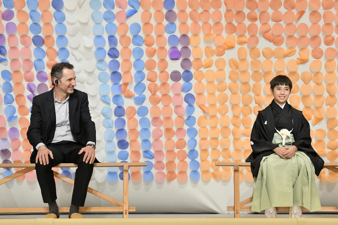 グザヴィエ・ヴェイヤン氏は、モンテックスのアーティスティック・ディレクターのアスカ・ヤマシタ氏と協働し、この舞台幕を構想。祝幕はエクリュカラーのファブリックの上に、マルチカラーのオーガンザをレーザーで丸くカットしたパーツ約8,900枚を組み合わせ、ピクセルアートのような形で抽象的なモチーフを形成。仕上げにチャコールグレーのオーガンザで「眞秀」の名と音羽屋の家紋である重ね扇に抱き柏が描かれています。